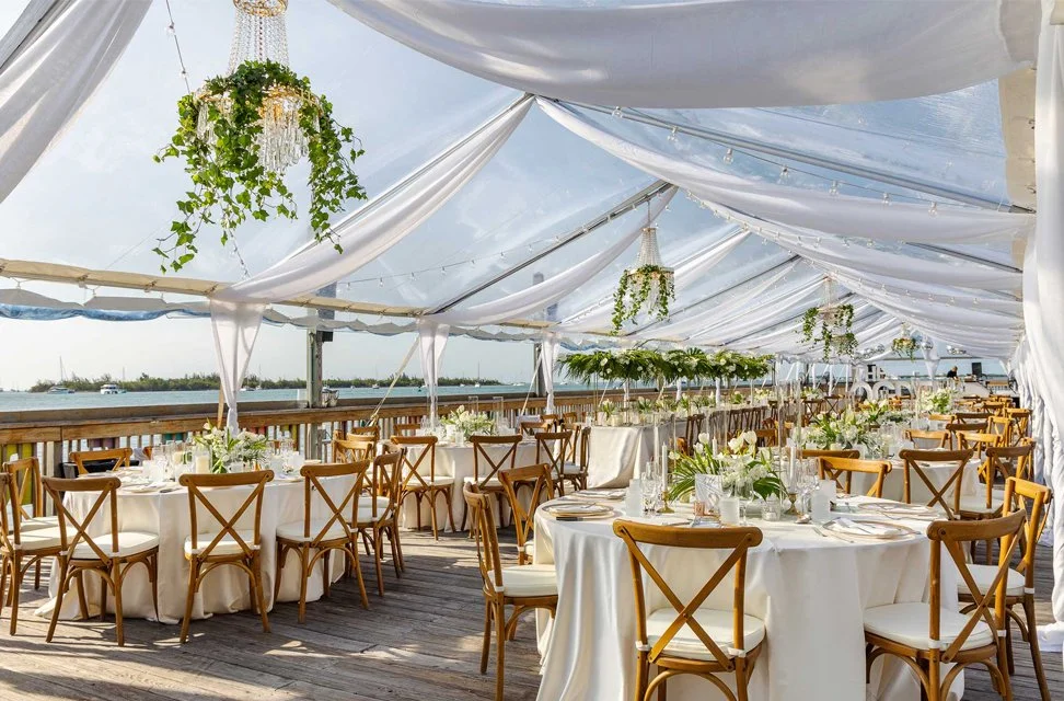All events are outdoors, overlooking the ocean with no beach or sand access. Expect warm days and cooler ocean breezes in the evening. A light shawl or jacket is perfect.